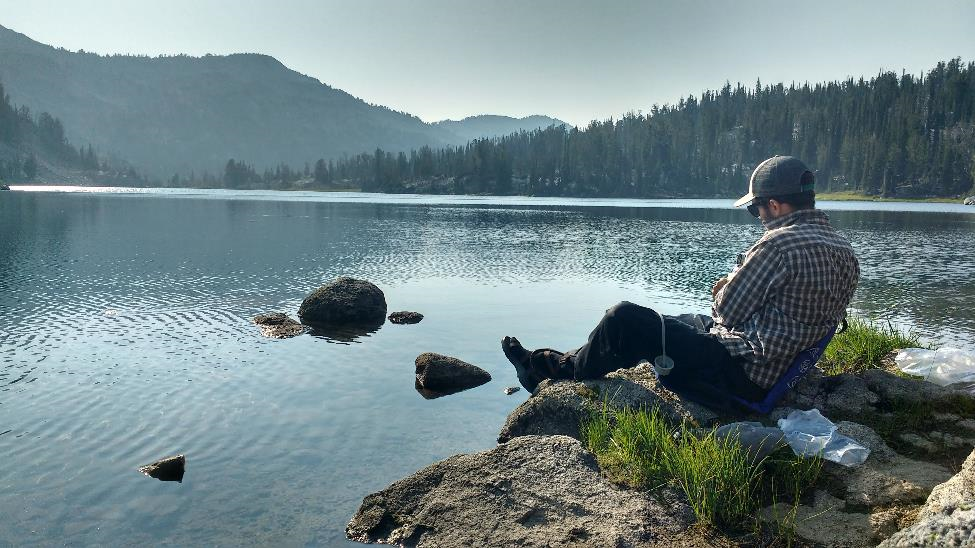 Already, the many campsites around this lake were filling up. We raced to check out the ones that didn’t already have groups setting up tents, and to our relief, we found the campsite of Ron’s dreams at the far end of the lake. Nestled into the base of a sheer granite cliff, it had its own little shoreline and just enough space for our tent.