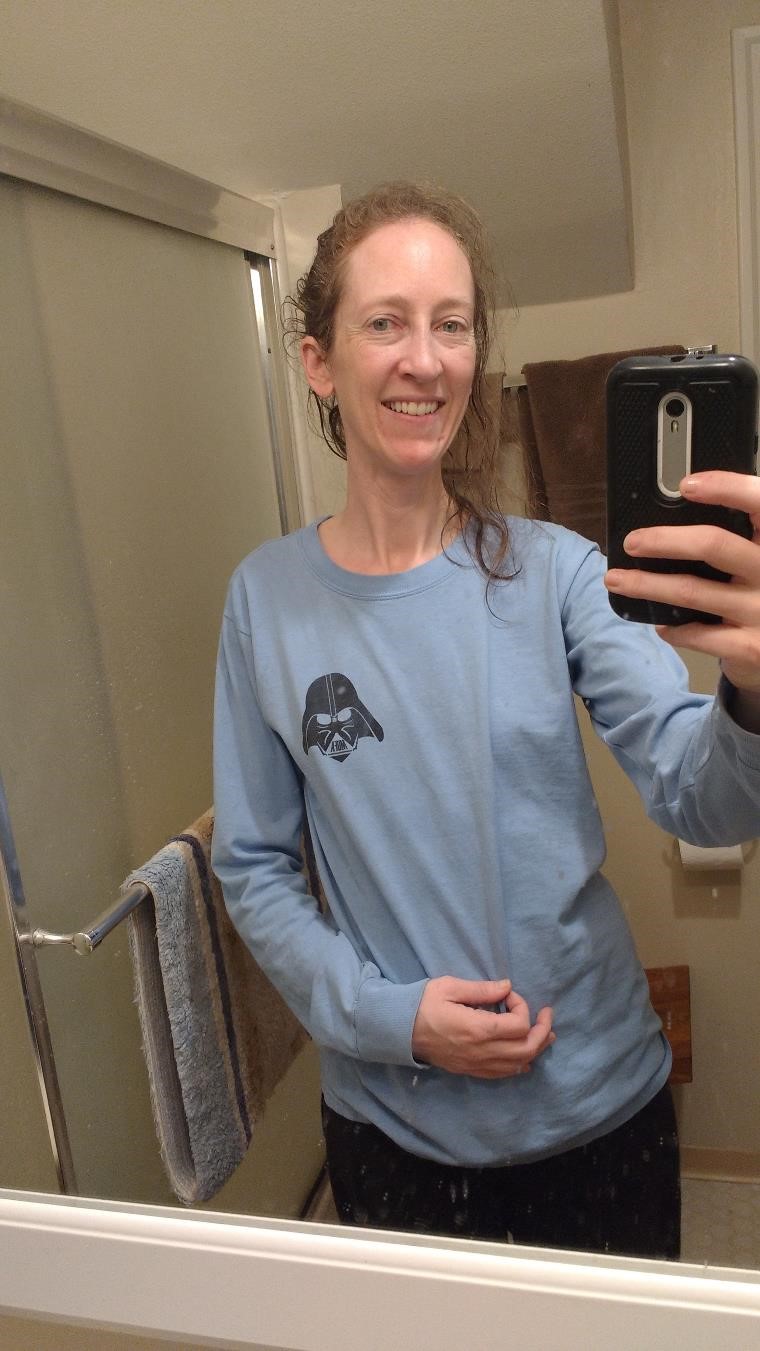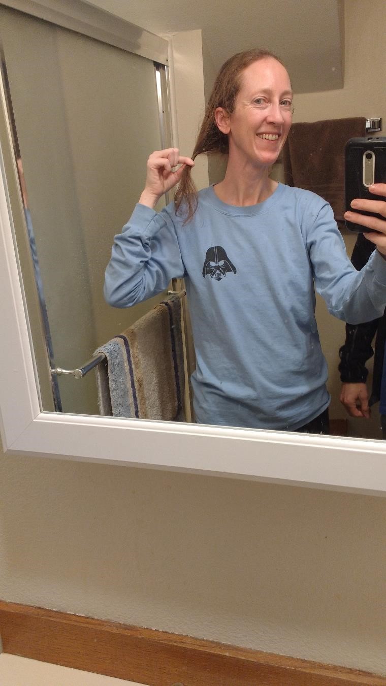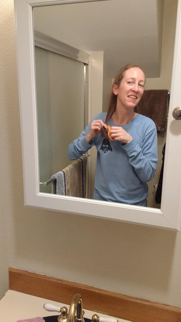 Someone texted back suggesting I try bangs. I’d never worn bangs, because my frizzy hair just flew in all directions if I cut it short around my face. I found several wigs with bangs. To my amazement, a pixie cut made me into the spitting image of my mom and sister, who both wore that same cut. I hadn’t realized how alike we all looked, and how it was mostly my hair that made me look different from them.