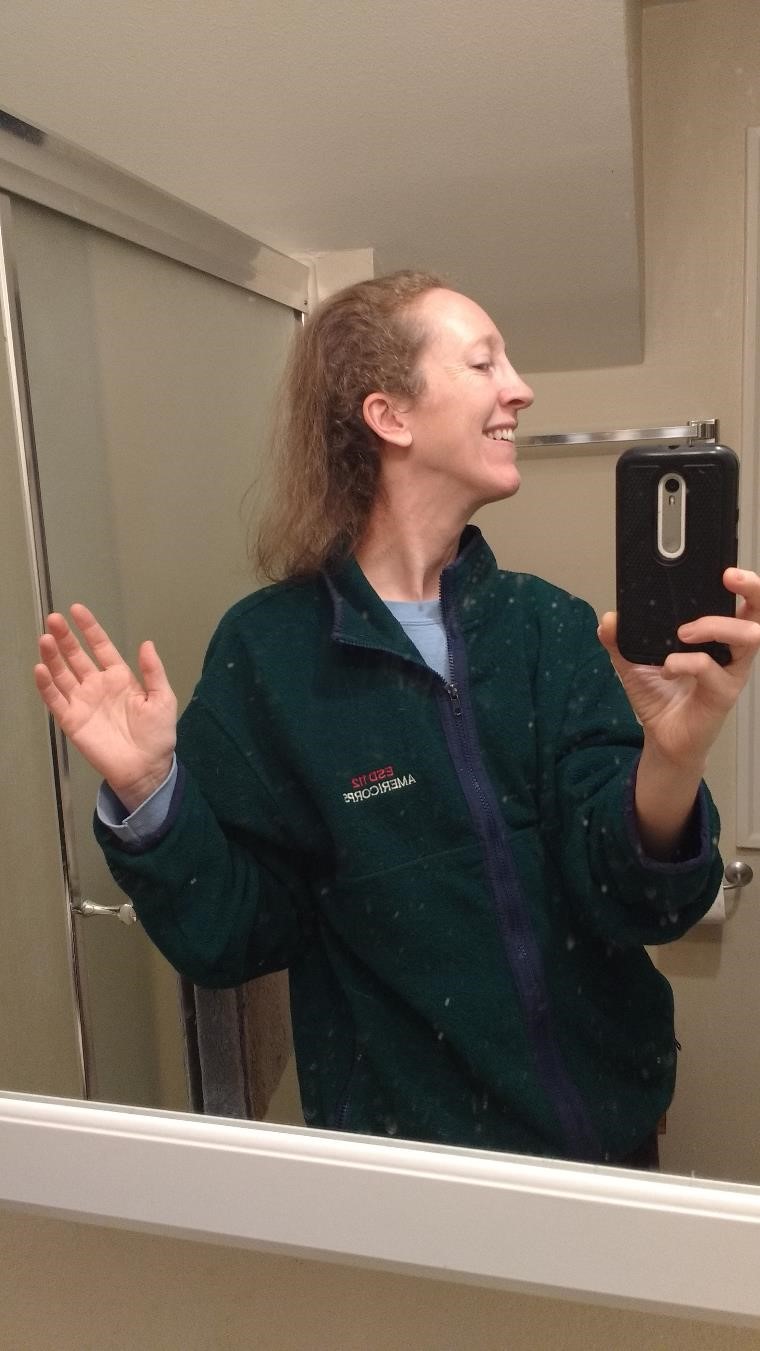 What magic! This first wig looked natural, yet also changed how I looked. Its hair had some wave, like mine, but less frizz than mine. It was better-behaved than my own hair. I liked the way it made me look!