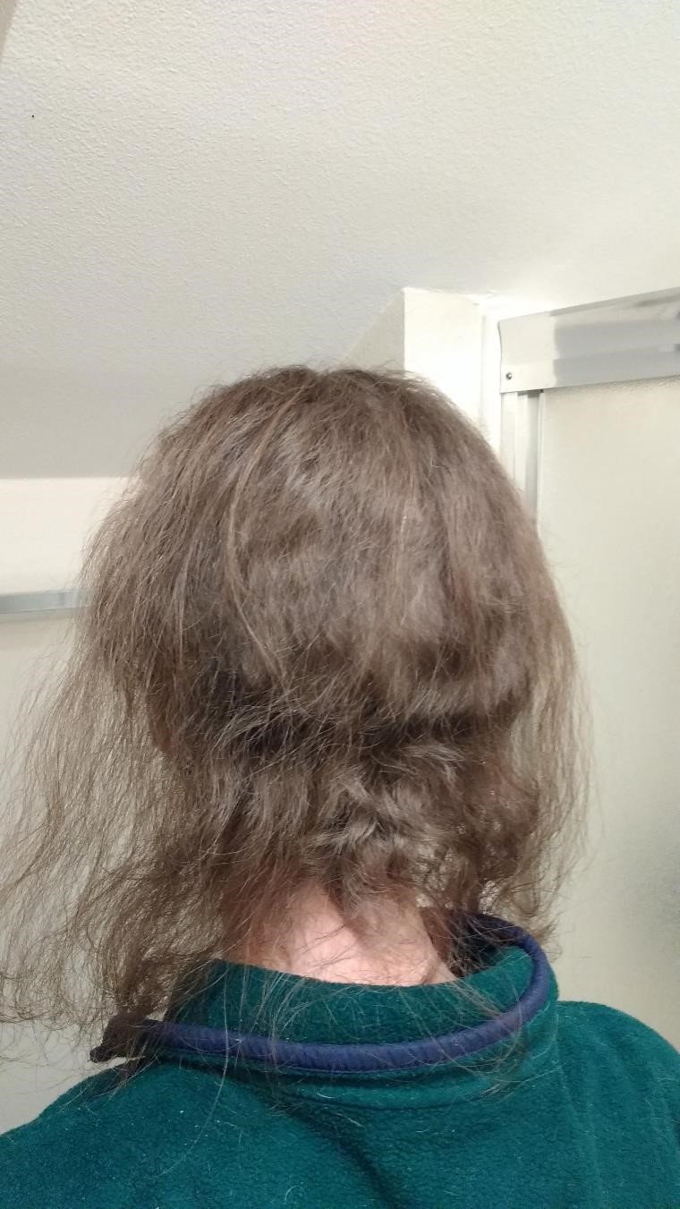 Over the following several months, the downy fuzz grew into a thick, satisfying mullet beneath my witch-like strands of remaining long hair. I kept it all tied up in my improvised, bobby-pinned style. At night I took it down before bed and periodically documented its changes or cut the longer hairs.
