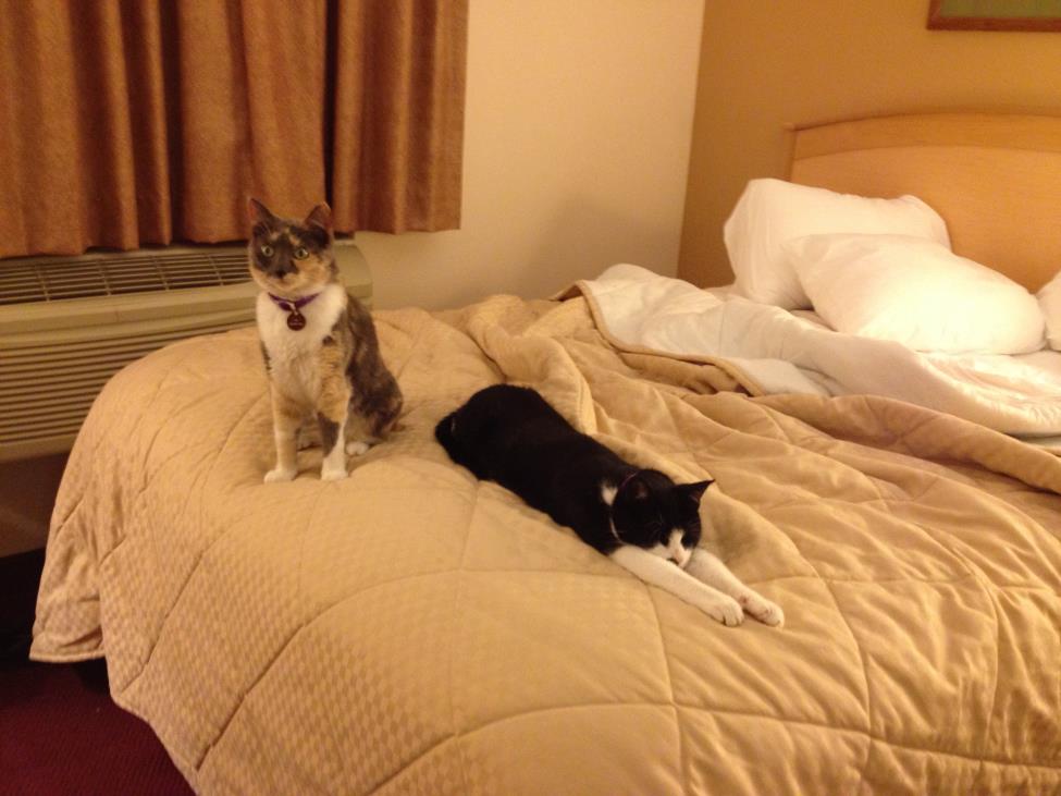 Settling into the motel each night was an ordeal. After checking in, we’d first bring the litter box into the motel room, then would bring in the cats. They always dashed out of the carrier to the nearest hiding places. Allowing them to cower there for a while, we’d next wrestle the heavy cooler inside, take all my food out and cram it into the mini-fridge, and dump the (largely melted) ice into the sink. Then we’d finally bring in our bags.